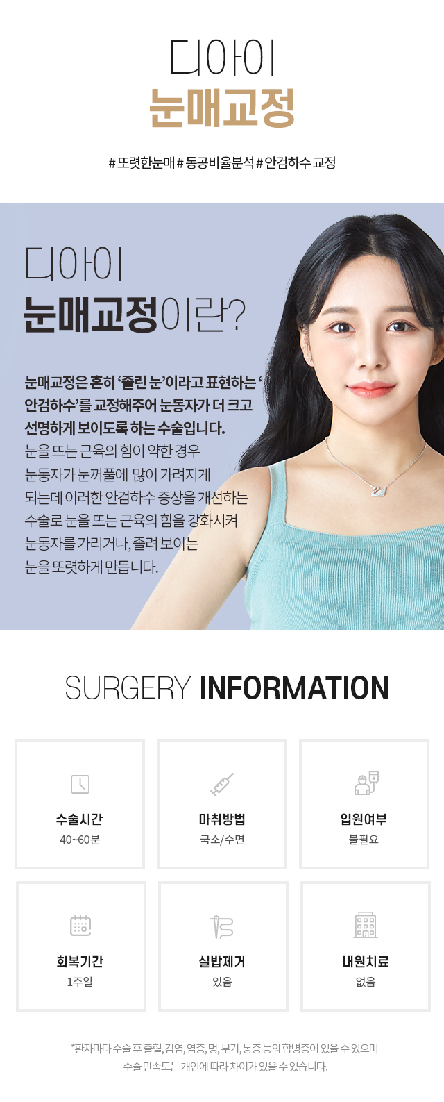성형수술 후 출혈, 감염, 염증 등 일반적으로 발생할 수 있는 합병증은개인에 따라서 정도의 차이가 있을 수도 있으므로 세심한 주의가 필요합니다.