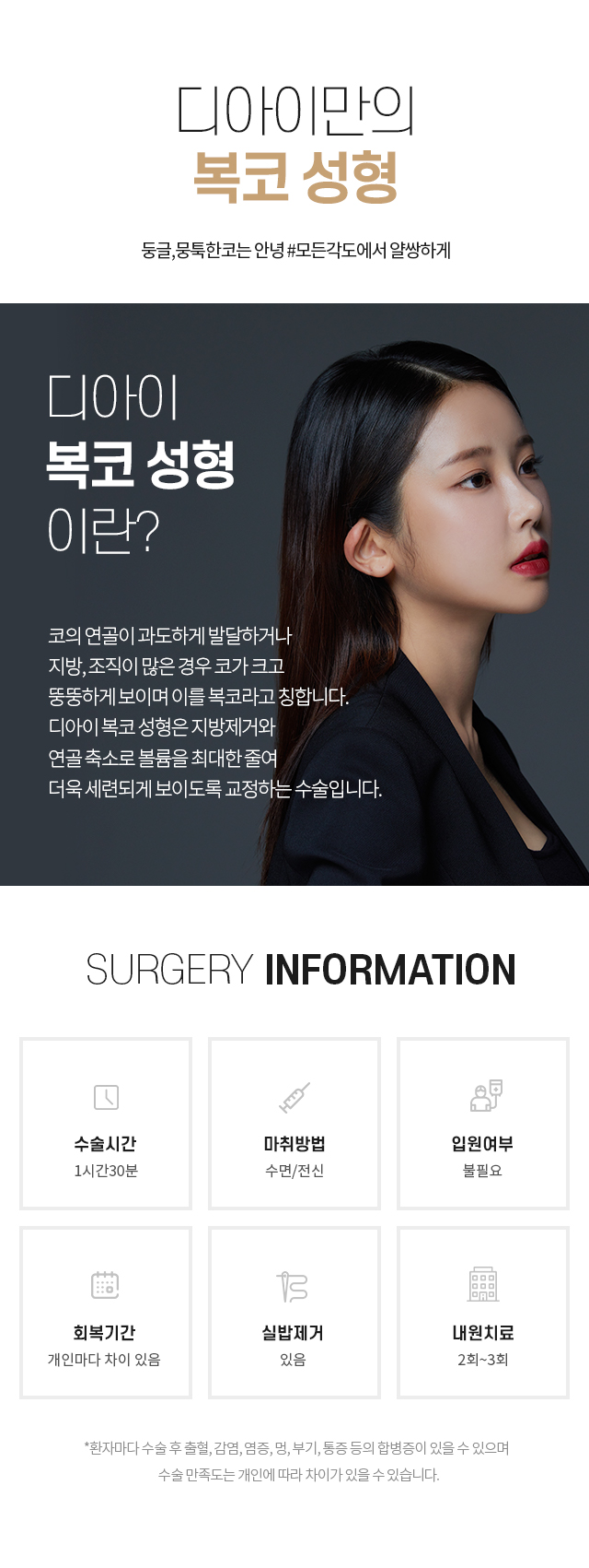 성형수술 후 출혈, 감염, 염증 등 일반적으로 발생할 수 있는 합병증은개인에 따라서 정도의 차이가 있을 수도 있으므로 세심한 주의가 필요합니다.