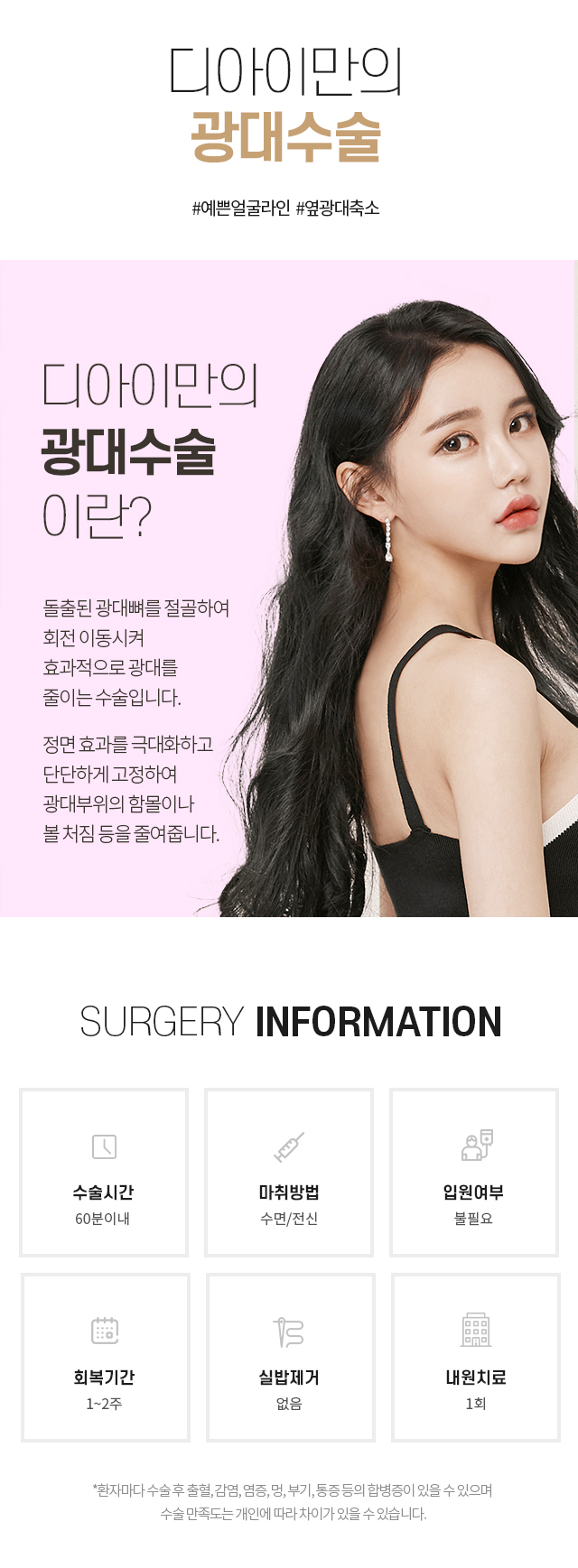 성형수술 후 출혈, 감염, 염증 등 일반적으로 발생할 수 있는 합병증은개인에 따라서 정도의 차이가 있을 수도 있으므로 세심한 주의가 필요합니다.