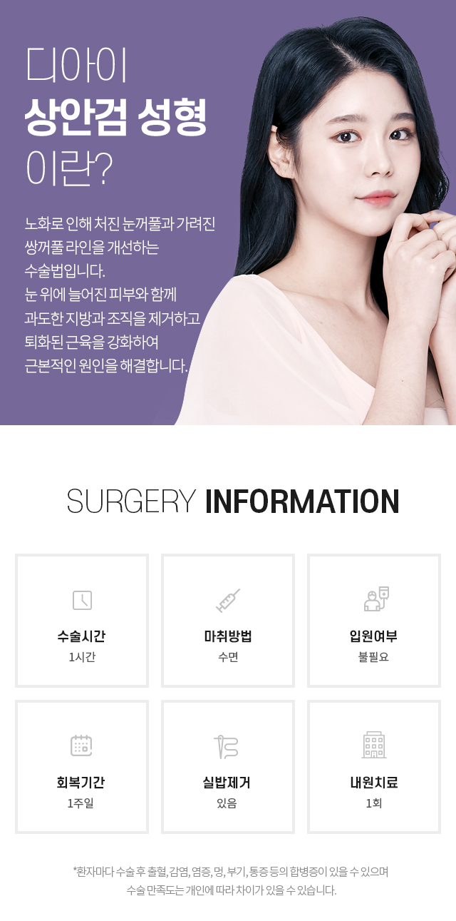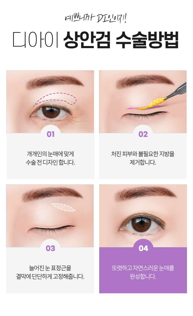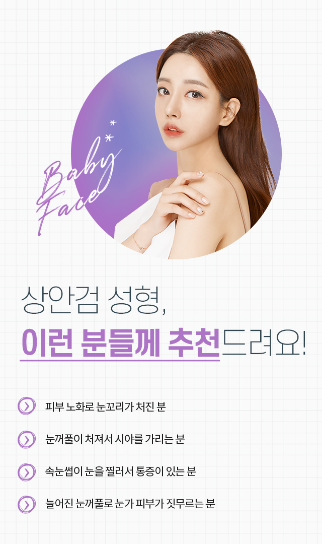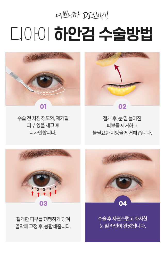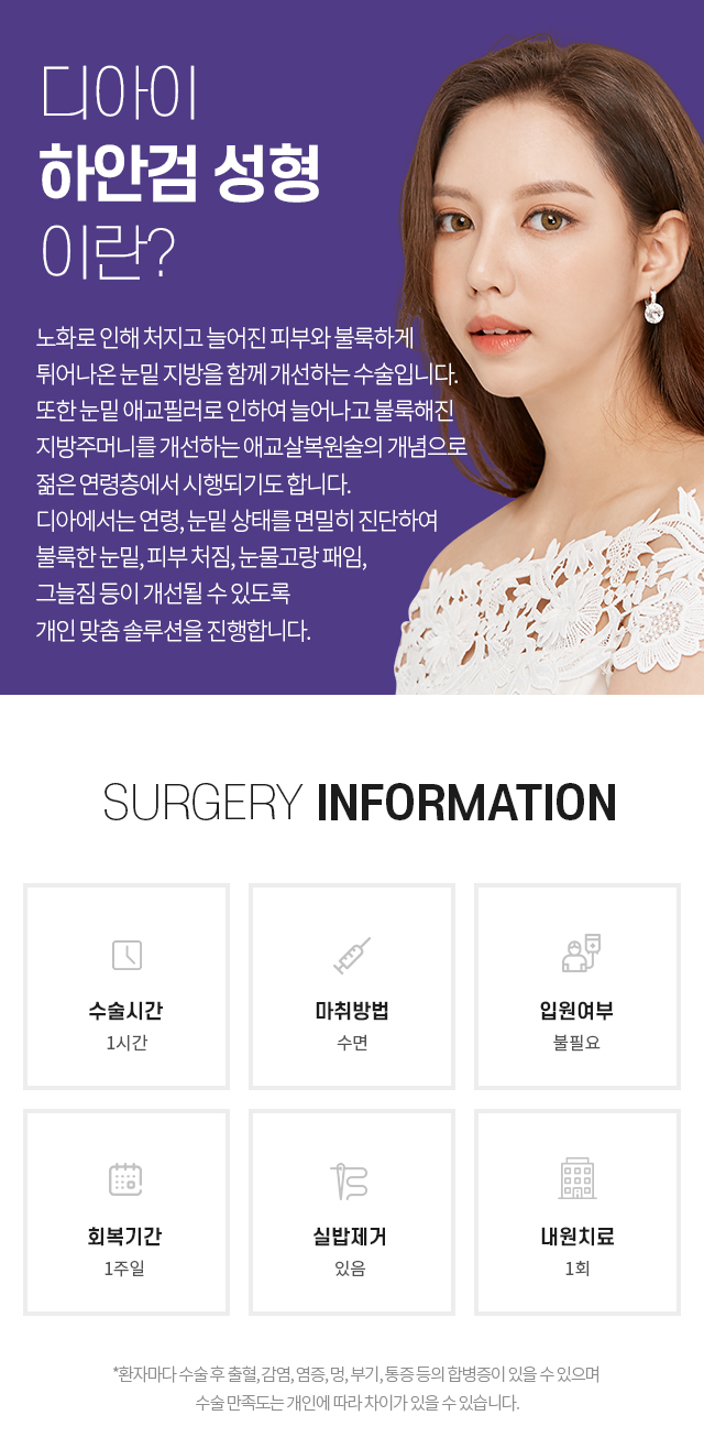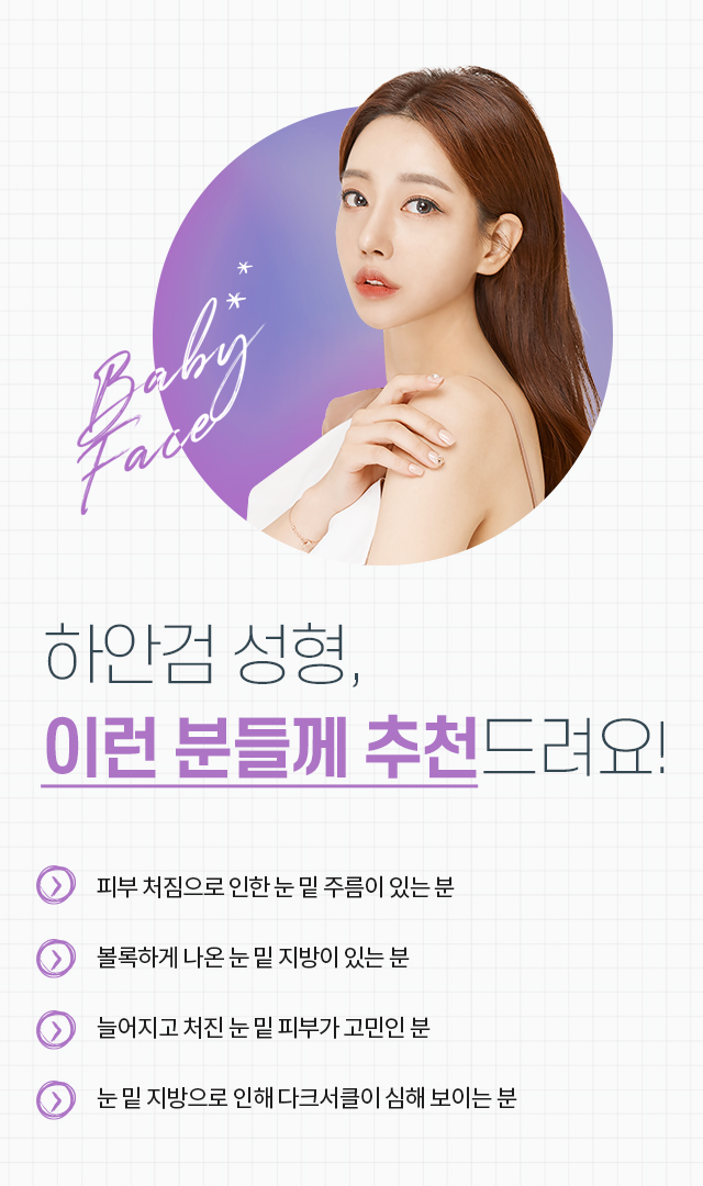 눈 밑 볼록한 지방을 제거하고 꺼진 부분은 지방을 재배치하여 눈 밑을 개선해 주는 수술입니다.