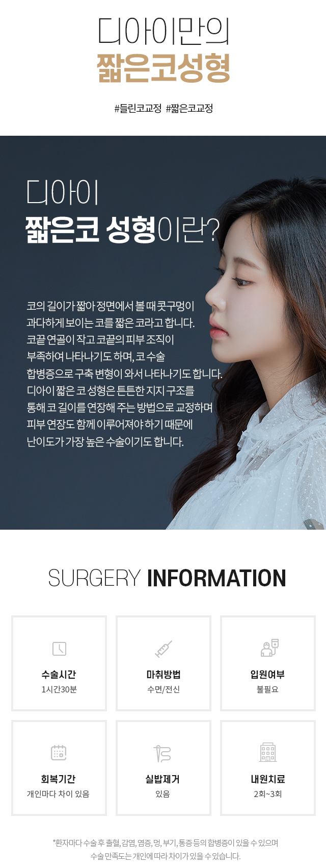 성형수술 후 출혈, 감염, 염증 등 일반적으로 발생할 수 있는 합병증은개인에 따라서 정도의 차이가 있을 수도 있으므로 세심한 주의가 필요합니다.